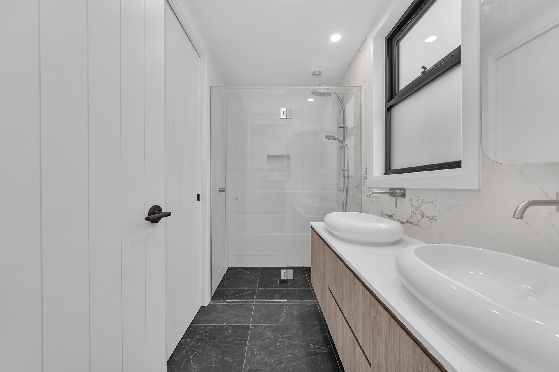 Internally, the home is a showcase of high-end architectural finishes—from polished concrete floors and timber details to floating staircases and expansive glazed windows that flood the space with natural light. Prioritising sustainability, the project achieved a 7-Star Energy Rating, incorporating passive design elements, high-performance insulation, and energy-efficient systems throughout.